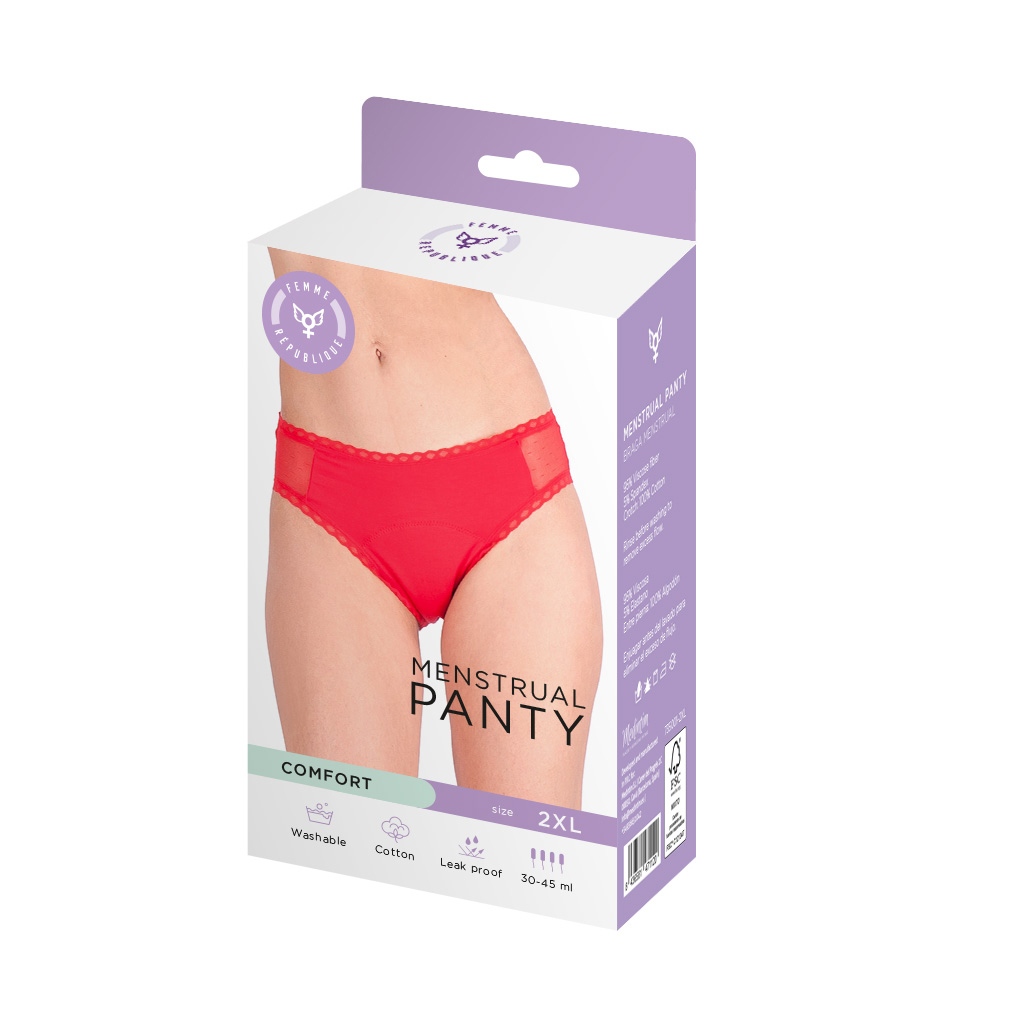 Braga menstrual diseñada para la absorción de fluidos vaginales, tanto de la menstruación, flujo o pérdidas urinarias. Esta braga incluye un refuerzo hasta la lumbar y está pensada para flujos más abundantes incluso para dormir. Se adapta a cualquier tipo de silueta, es muy agradable al tacto y cómoda. Incorpora una goma elástica de encaje en la zona de la cintura para un mayor ajuste, finas tiras de encaje en los bordes y la parte de la zona íntima está elaborada con 3 capas para una mayor absorción. Entre todas las ventajas que ofrece este producto, podemos decir que proporciona un ahorro económico, es reutilizable, ecológico y seguro para el cuerpo.